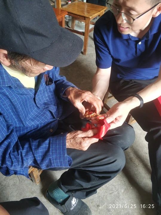 印象最深刻的是我們慰問的第一位老黨員——仁龍村黨支部的楊勝榮同志。剛踏入他家門的時候,楊勝榮同志竟第一時間叫出了我的名字,我在詫異之際又備受觸動。突然回想起來,他就是參加自己在仁龍村開展的黨史學習教育宣講遇到的那位老黨員。那一天,當我將“光榮在黨50年”紀念章交到他手上的時候,他臉上綻放了笑容,激動地說:“我黨齡已過50年,年齡已到90歲,我要把共產黨員的優良傳統發揚下去!”這樸實無華的語言,是那么堅定、那么鏗鏘有力!