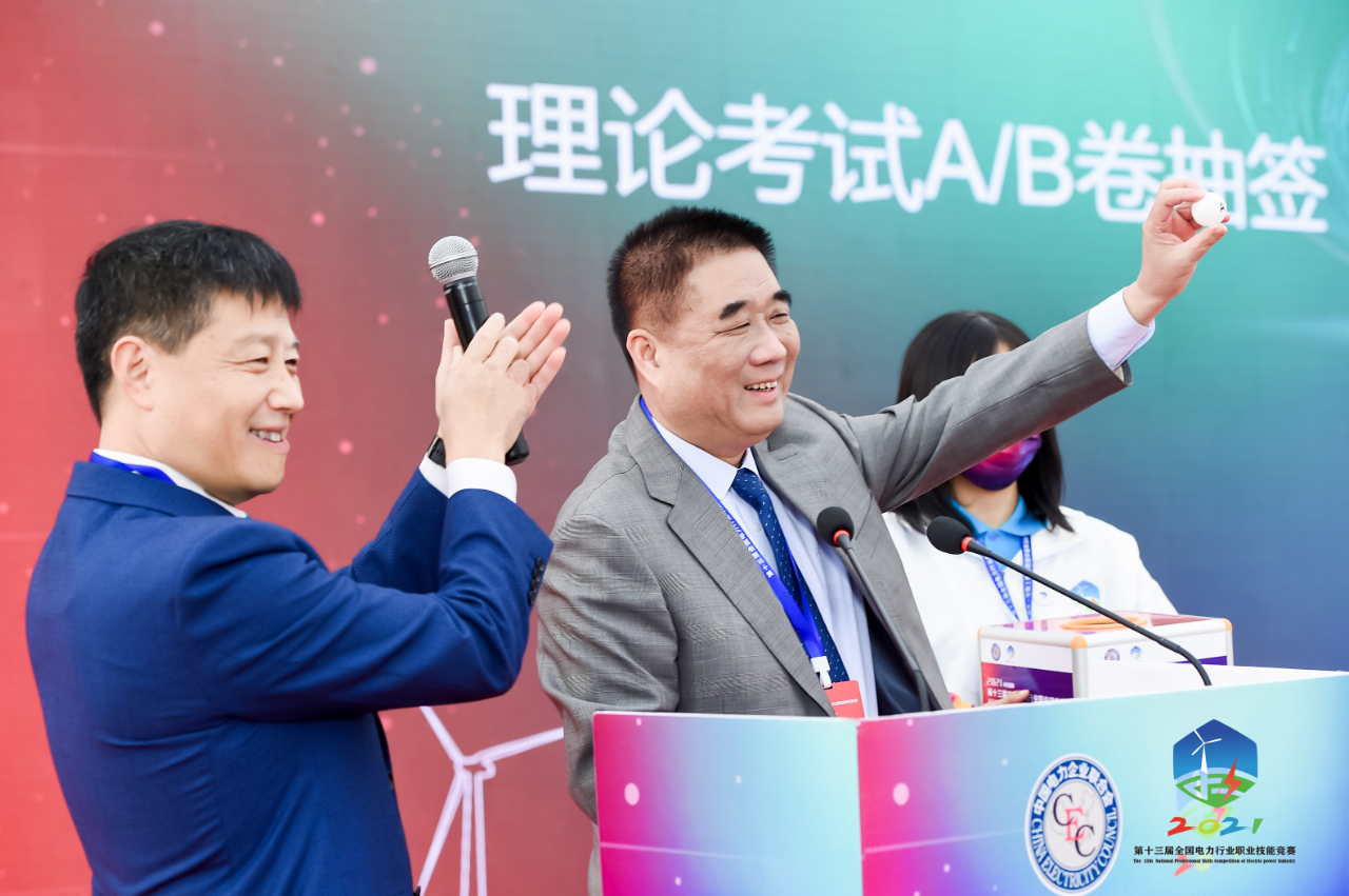 中國電力企業(yè)聯(lián)合會領(lǐng)導(dǎo)冮宇峰代表競賽組委會抽取了理論考試試題。