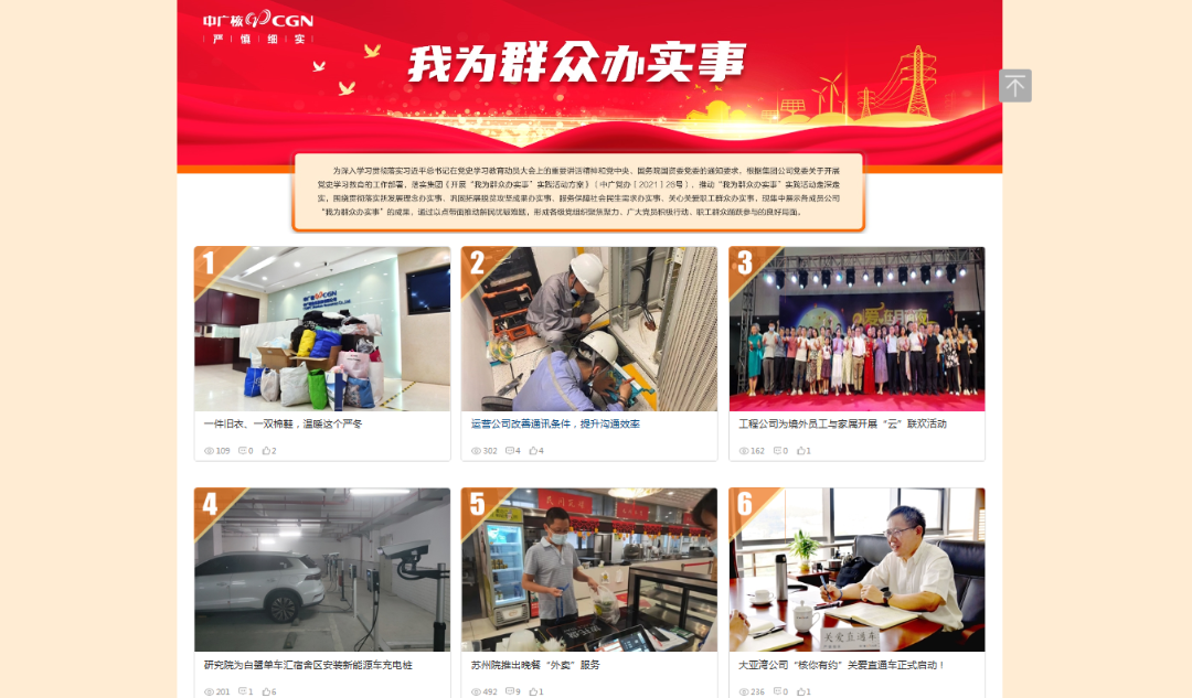 開設(shè)“我為群眾辦實(shí)事”專題網(wǎng)頁,曬辦實(shí)事成果。中廣核推出專題網(wǎng)頁,集中展示各單位“我為群眾辦實(shí)事”代表性成果,每月對(duì)成果進(jìn)行滾動(dòng)更新。通過各單位曬成果,接受群眾監(jiān)督、開展群眾評(píng)價(jià),形成各級(jí)黨組織聚焦聚力、廣大黨員積極行動(dòng)、員工群眾踴躍參與的良好局面。