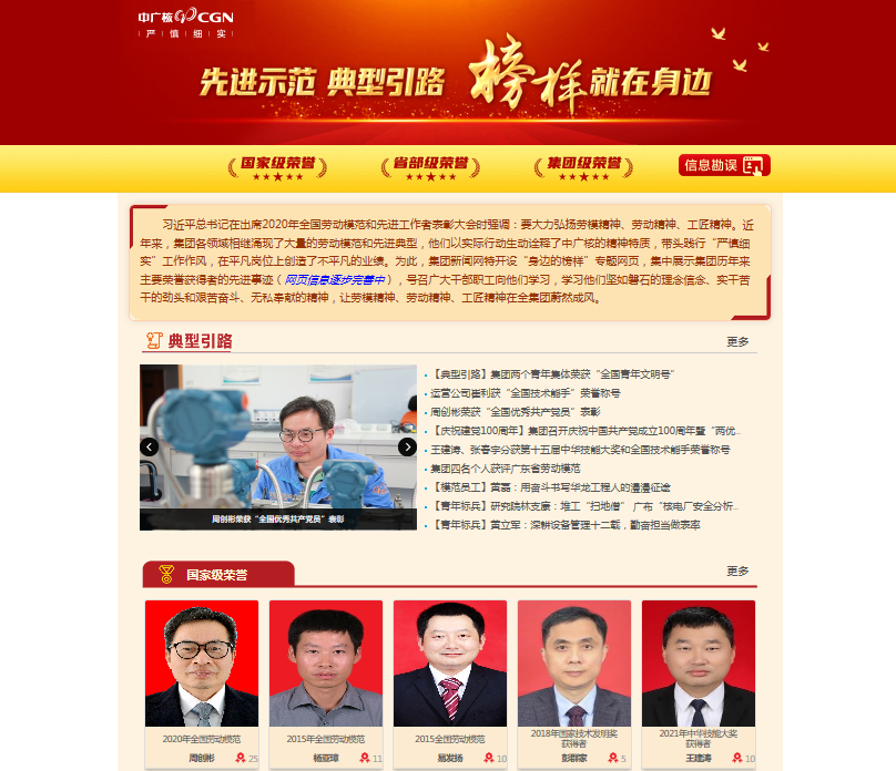 搭建“身邊的榜樣”專題網(wǎng)頁,傳播先進(jìn)典型事跡。中廣核策劃推出“身邊的榜樣”專題網(wǎng)頁,按照國家級(jí)、省部級(jí)、集團(tuán)級(jí)分類梳理建立個(gè)人榮譽(yù)檔案,集中展示先進(jìn)典型的主要榮譽(yù)、工作經(jīng)歷、歷年獲獎(jiǎng)情況、先進(jìn)事跡、主要貢獻(xiàn)及相關(guān)事跡報(bào)道,以身邊榜樣的優(yōu)秀事跡,展現(xiàn)中廣核人的優(yōu)良傳統(tǒng),彰顯中廣核人的精神底色。