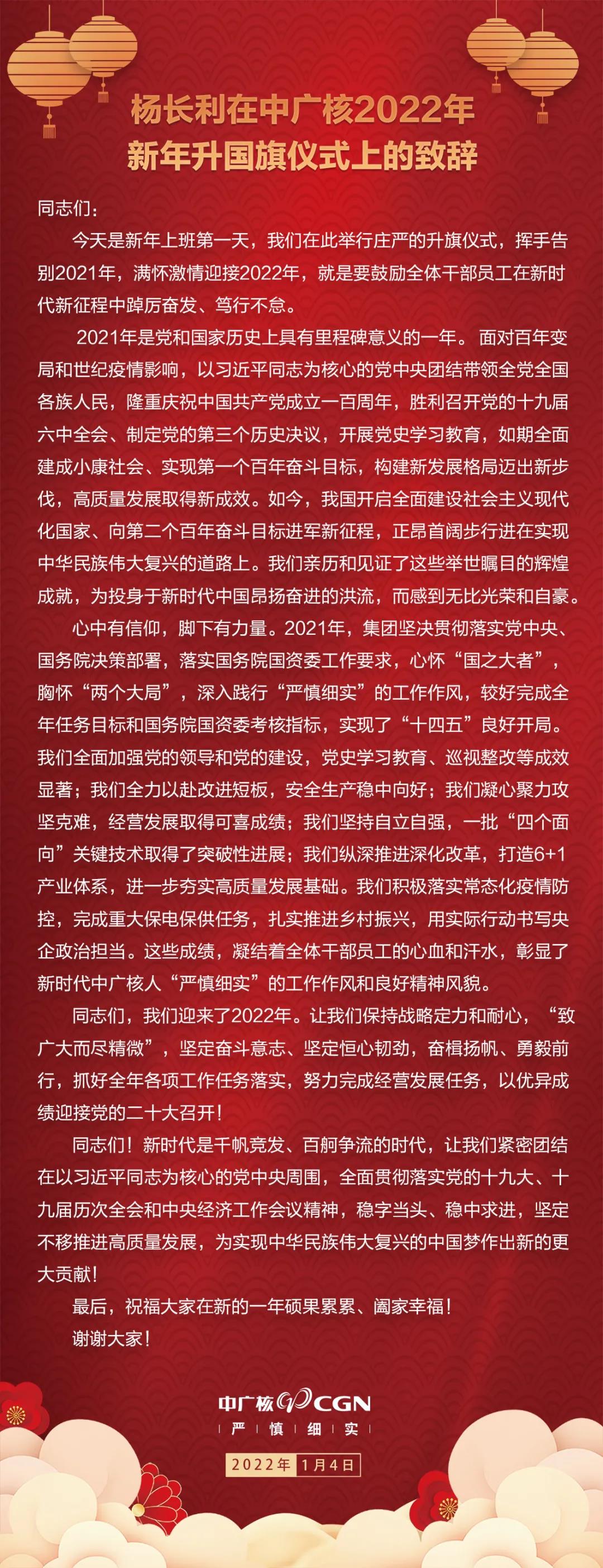 1月4日,中國(guó)廣核集團(tuán)有限公司(簡(jiǎn)稱“中廣核”)在深圳總部中廣核大廈舉行新年升國(guó)旗儀式,向偉大祖國(guó)獻(xiàn)上最美好的新年祝福,鼓舞激勵(lì)全體干部員工踔厲奮發(fā)、篤行不怠,以優(yōu)異成績(jī)迎接黨的二十大召開(kāi)。中廣核黨委書(shū)記、董事長(zhǎng)楊長(zhǎng)利參加升旗儀式并發(fā)表致辭,黨委副書(shū)記、總經(jīng)理高立剛主持升旗儀式。中廣核黨委常委、總經(jīng)理部成員,中國(guó)廣核電力股份有限公司經(jīng)營(yíng)高管,中廣核各部門及部分成員公司干部員工代表,參加了升旗儀式。
