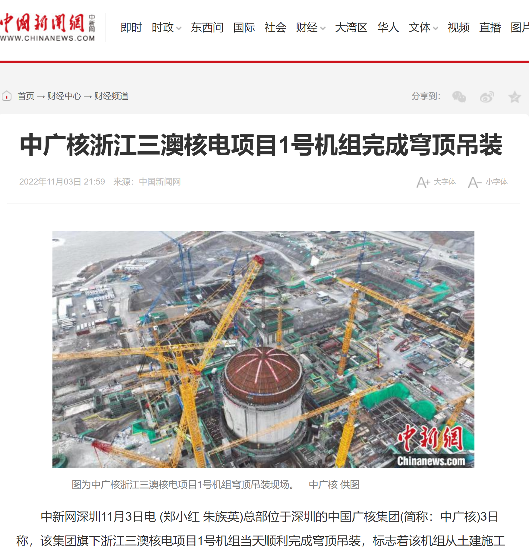 11月3日,中國廣核集團(tuán)浙江三澳核電項(xiàng)目1號機(jī)組順利完成穹頂?shù)跹b,標(biāo)志著1號機(jī)組從土建施工階段全面轉(zhuǎn)入設(shè)備安裝階段,為進(jìn)一步高質(zhì)量穩(wěn)步推進(jìn)工程建設(shè)奠定了基礎(chǔ)。