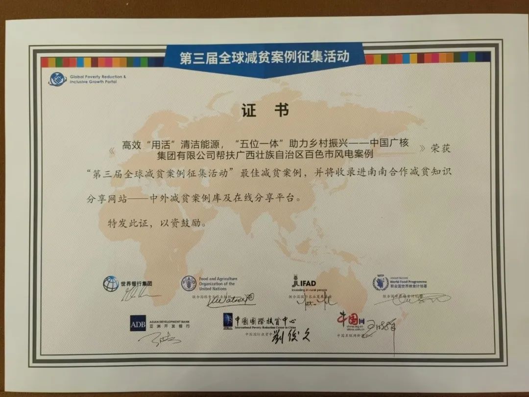 隨后,楊長利一行來到樂業(yè)縣邏沙鄉(xiāng)草王山樂業(yè)風電和集中式光伏項目現(xiàn)場。樂業(yè)風電是“央企入桂”重大項目,也是中廣核定點幫扶的“明星”項目。2020年,中廣核積極發(fā)揮在清潔能源領域的技術、資金、人才等優(yōu)勢,立足樂業(yè)縣的資源稟賦實際情況和產(chǎn)業(yè)發(fā)展切實需求,因地制宜,科學決策,在樂業(yè)縣投資約12億元,建設樂業(yè)17.2萬千瓦風電產(chǎn)業(yè)幫扶項目。項目創(chuàng)新采用“入股分紅+贈股分紅+保底收益”特色幫扶模式,由中廣核和樂業(yè)縣63個村集體共同持股。項目投運后,在20年運營期內(nèi)每年進行分紅,確保村集體經(jīng)濟可持續(xù)增收,惠及11萬人口。9月16日,項目為63個村首次分紅共計458萬元,平均每個村集體增收超7萬元。項目打造的“風車花海”已成為網(wǎng)紅打卡景觀,高峰期每天游客4000余人。11月11日,項目榮獲第三屆全球減貧案例征集活動“最佳減貧案例”,將在全球范圍內(nèi)展示與推廣。