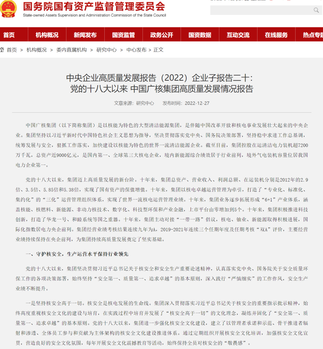 國(guó)資委官網(wǎng)刊載《中央企業(yè)高質(zhì)量發(fā)展報(bào)告(2022)企業(yè)子報(bào)告二十:黨的十八大以來(lái)中國(guó)廣核集團(tuán)高質(zhì)量發(fā)展情況報(bào)告》