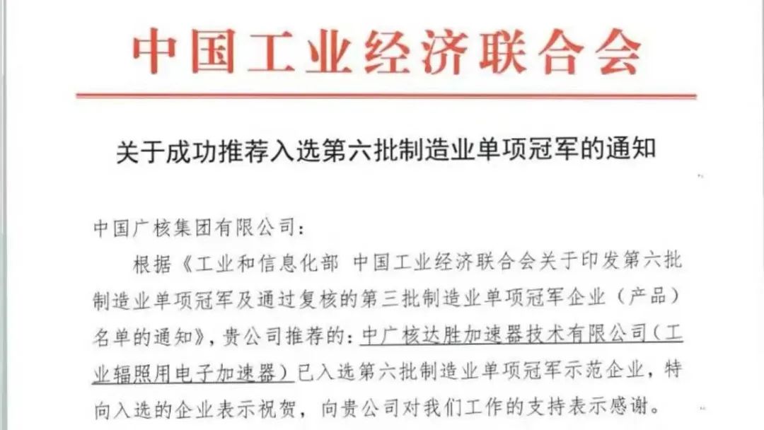 ▲2021年12月,中廣核達勝入選工信部第六批制造業(yè)單項冠軍企業(yè)