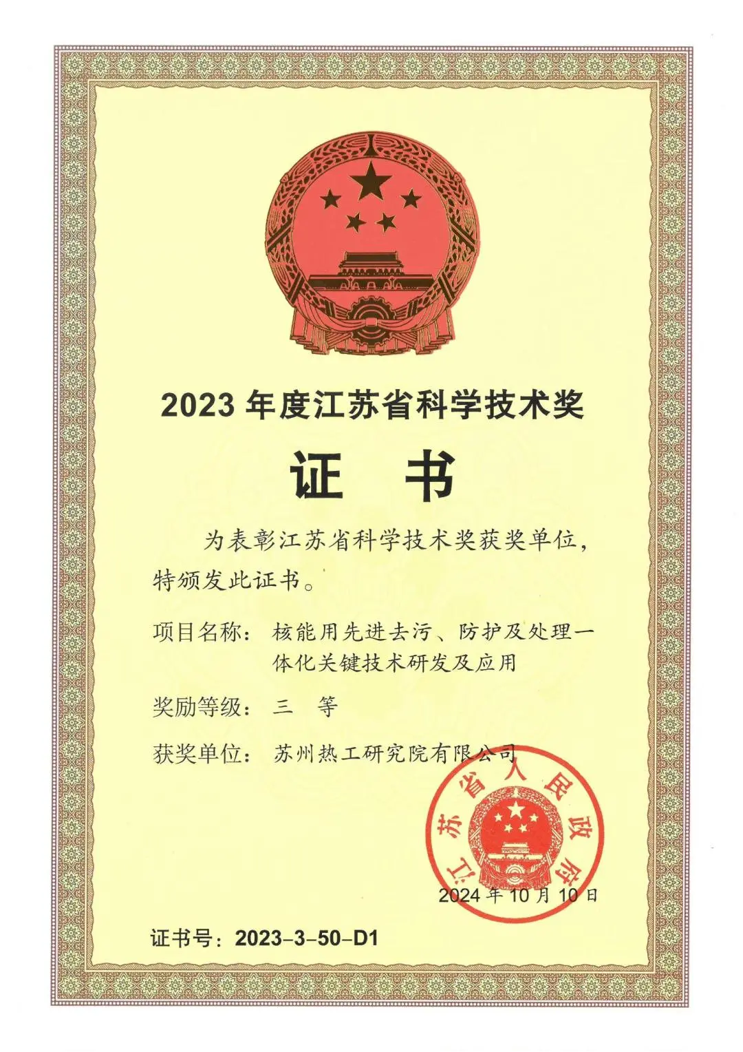 近期,中廣核連續收獲科學技術領域獎項!在11月19日召開的北京市科技大會暨科學技術獎勵大會上,由清華大學提名,中廣核技下屬達勝加速器技術有限公司、達勝科技有限公司參與完成的“電子束輻照處理廢水的關鍵技術、裝備及應用”項目斬獲北京市科學技術獎技術發明獎一等獎。此外,從蘇州市科技局也傳來喜訊,蘇州熱工研究院有限公司牽頭完成的“核能用先進去污、防護及處理一體化關鍵技術研發及應用”項目榮獲江蘇省科學技術獎三等獎。